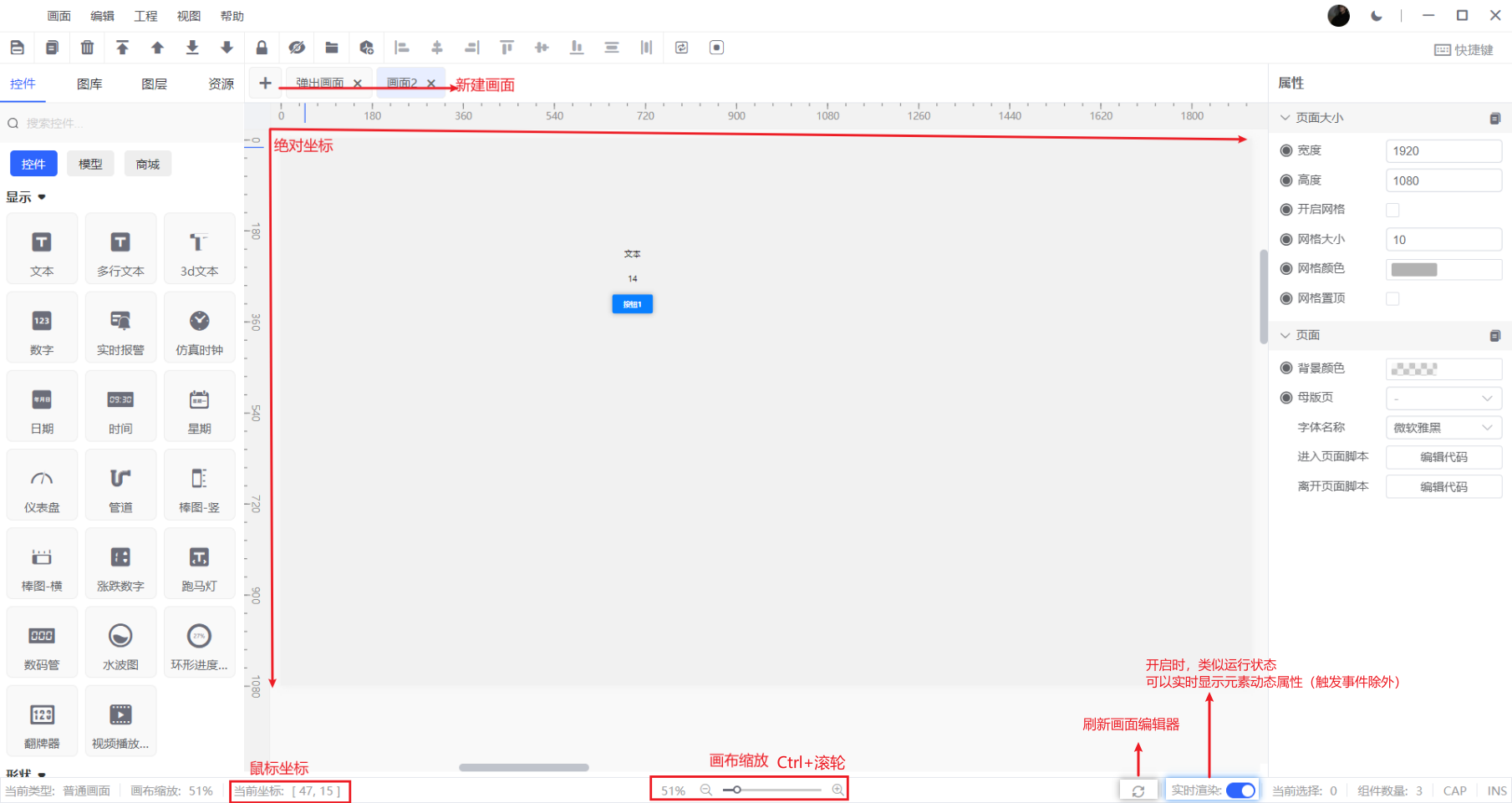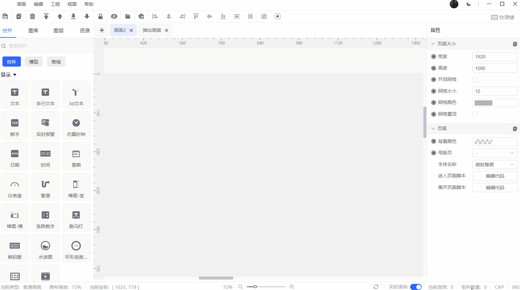 画面是整个组态的绘图区域,支持新建画面、操作元素等功能。支持画布缩放(Ctrl+鼠标滚轮)、画布移动(Ctrl+鼠标左键)